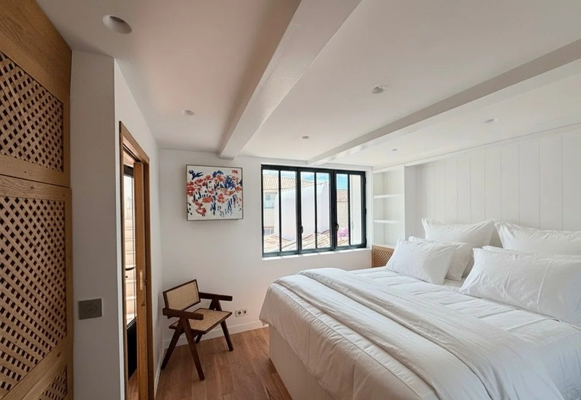 À la demande d’un groupe hôtelier, nous avons rénové une demeure historique au cœur de Saint-Martin-de-Ré. En concertation avec les Bâtiments de France, nous avons préservé les éléments emblématiques — tomettes anciennes, escalier intérieur, mât de bateau dans la cheminée — tout en insufflant un design minimal et minéral.